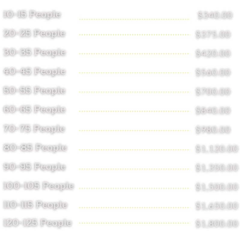 Our standard packages scale for groups of 10 to 100+ guests, giving you the flexibility to choose the right fit for your event.